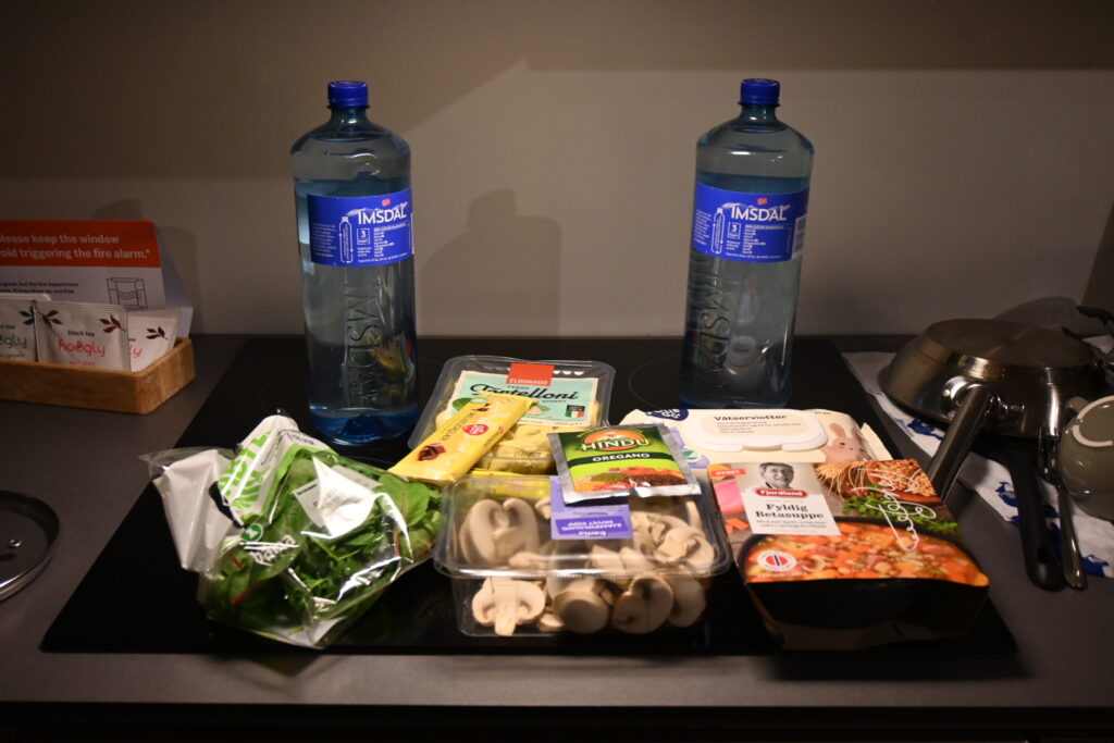 前日に買った飲料水2本と、温めるだけのスープ、マッシュルームやニョッキはサーモンと一緒に食べる想定、ベビーリーフ。