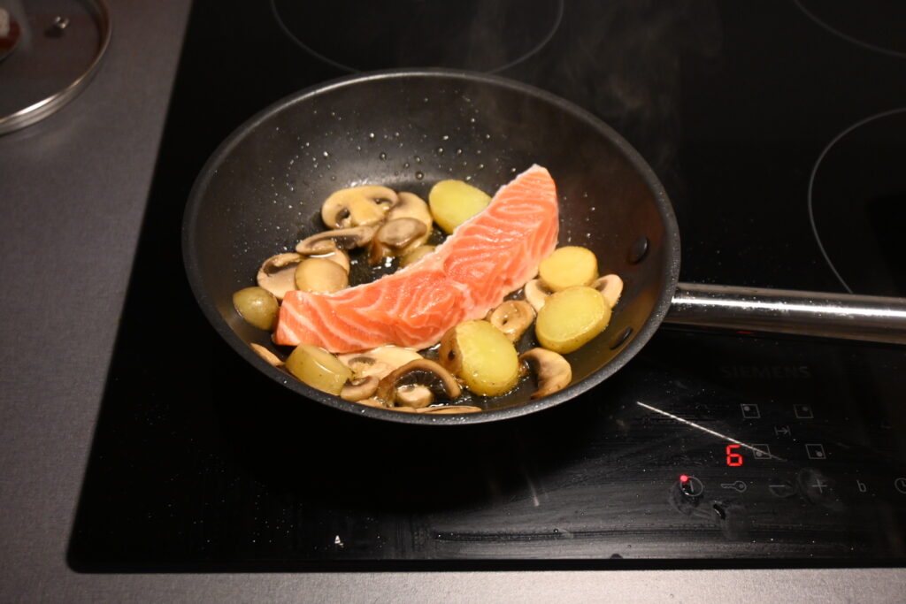 この日の夕食は、前日に買って冷蔵庫に入れておいたサーモントラウトをメインディッシュに。