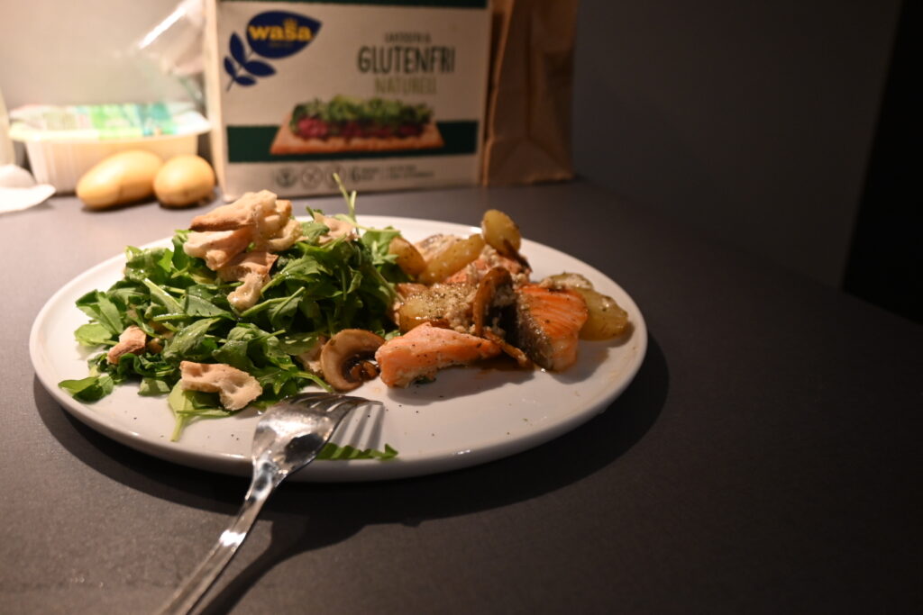 さらにマッシュルームを焼き、ベビーリーフとともにそえ(サーモンは盛り付け時にくずれてしまった)とりあえずのワンプレートになりました。