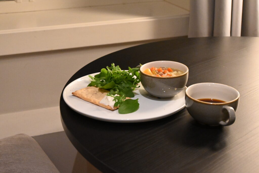 5日目の朝ごはんは、買ってあったスープと、クラッカーと、ベビーリーフ、コーヒー。